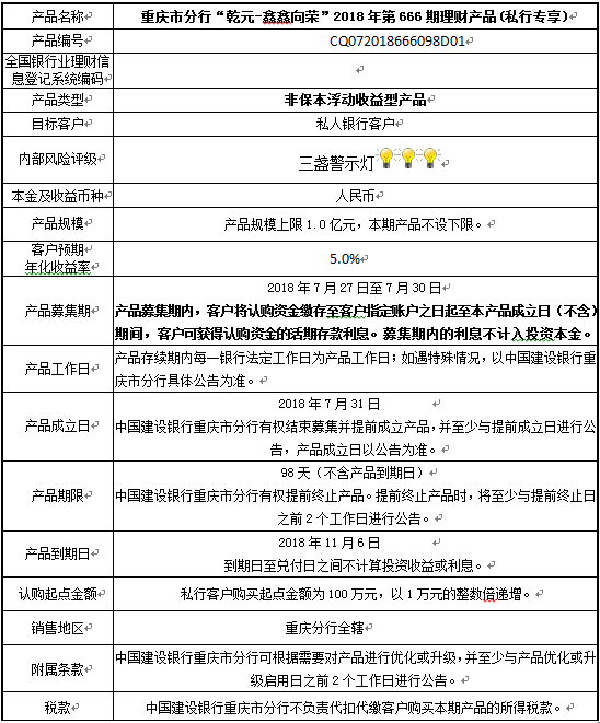 1.本期产品规模上限:1.0亿元。在本期产品募集期内,对本期产品的认购金额达到本期理财产品规模上限,则中国建设银行重庆市分行有权利但无义务停止本期产品的认购,已经认购成功的客户投资权益不受影响。