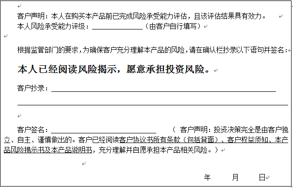 个人客户请在下面填写您的风险承受能力评级、抄录风险揭示语句并签字: