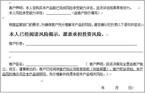 个人客户请在下面填写您的风险承受能力评级、抄录风险揭示语句并签字: