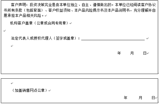 客户签名: ( 客户声明:投资决策完全是由客户独立、自主、谨慎做出的。客户已经阅读客户协议书所有条款(包括背面)、客户权益须知、本产品风险揭示书及本产品说明书,充分理解并自愿承担本产品相关风险。)
