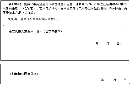 客户签名: ( 客户声明:投资决策完全是由客户独立、自主、谨慎做出的。客户已经阅读客户协议书所有条款(包括背面)、客户权益须知、本产品风险揭示书及本产品说明书,充分理解并自愿承担本产品相关风险。)