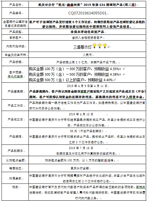 3.中国建设银行重庆市分行可根据市场情况等调整产品规模上、下限,并最迟于调整规模上下限当日进行公告。