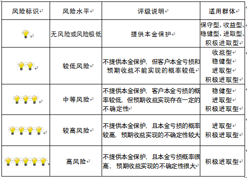 本产品为非保本浮动收益型理财产品,不保证本金和收益,请您充分认识投资风险,谨慎投资。本期产品期限为133天(中国建设银行有权对产品进行展期或提前终止),存续期内,产品不接受申购或赎回申请。本期产品内部风险评级级别为三盏警示灯 ,风险水平属于中等风险。最不利情况下,您将损失全部收益甚至包括全部本金。本理财产品适用于稳健型、进取型 、积极进取型客户。