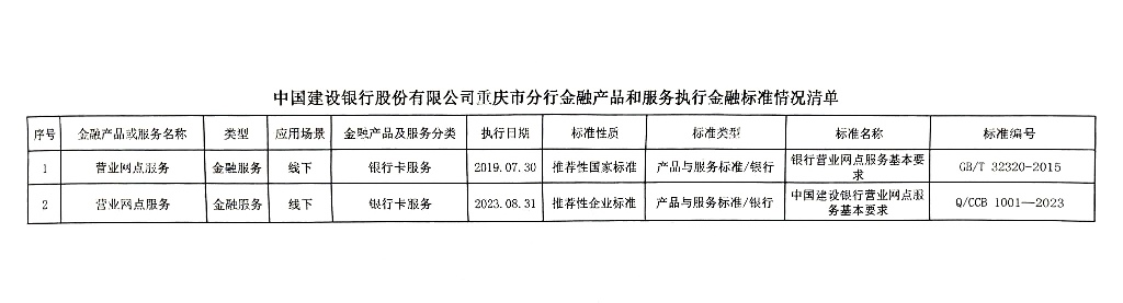 中国建设银行股份有限公司重庆市分行金融产品和服务执行金融标准情况清单