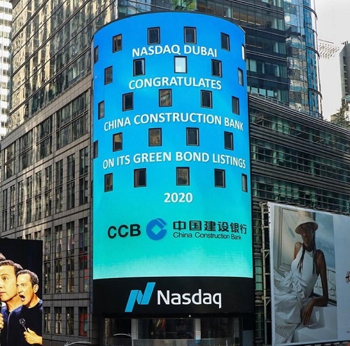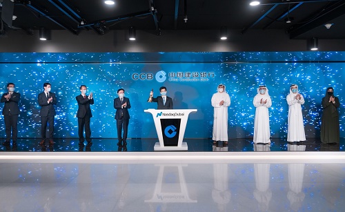 2020年8月18日,在纳斯达克迪拜交易所举行了庆祝中国建设银行绿色债券在纳斯达克迪拜成功上市的摇铃仪式。中华人民共和国驻迪拜总领事李旭航先生、中国建设银行迪拜国际金融中心分行袁盛瑞总经理、迪拜国际金融中心(DIFC)行政长官兼迪拜金融市场(DFM)主席伊萨·卡辛姆阁下及迪拜国际金融中心和纳斯达克迪拜的高管人员出席了摇铃仪式。