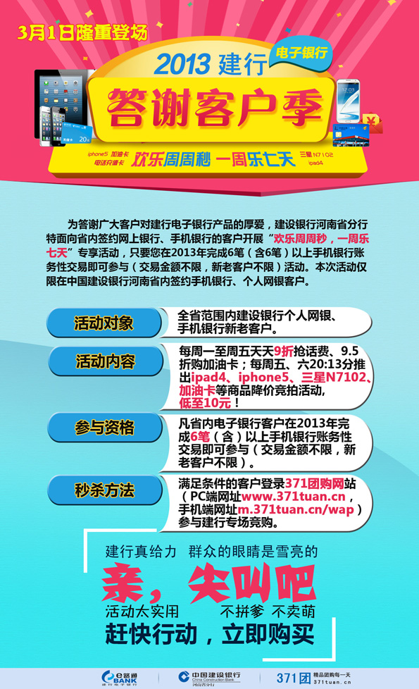 2、本次活动秒中信息及领取方式将通过短信、河南分行国际互联网站及371团购网站等形式通知和公布。