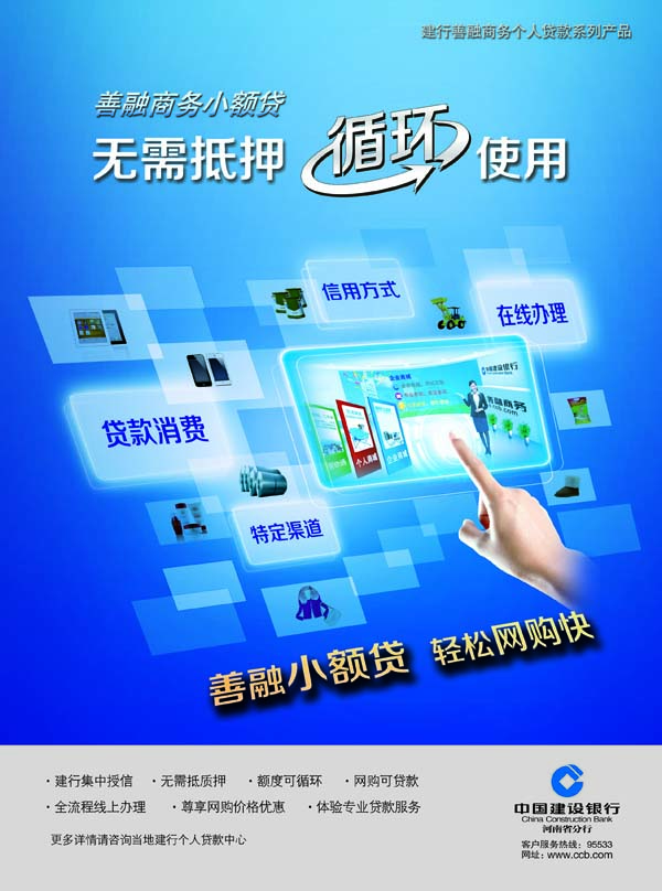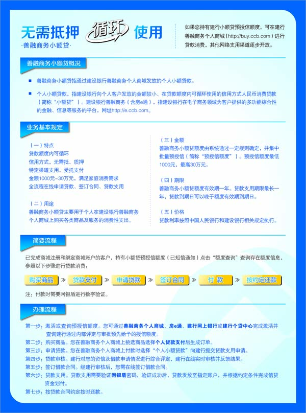如果您持有建行小额贷预授信额度,可在建行善融商务个人商城进行贷款消费,其他电子渠道后续将逐步开放。查询渠道包括建行网上银行、善融商务个人商城、房E通或建行个贷中心,贷款全流程在线办理,让您在尊享网络价格优惠的同时,体验我行专业个人贷款服务,详情请咨询95533或当地个贷中心。