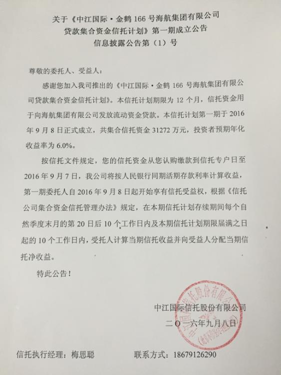由中国建设银行江西省分行代理销售的中江国际信托股份有限公司“中江国际·金鹤166号海航集团有限公司贷款集合资金信托计划”已正式成立,信托资金用于向海航集团有限公司发放流动资金贷款。