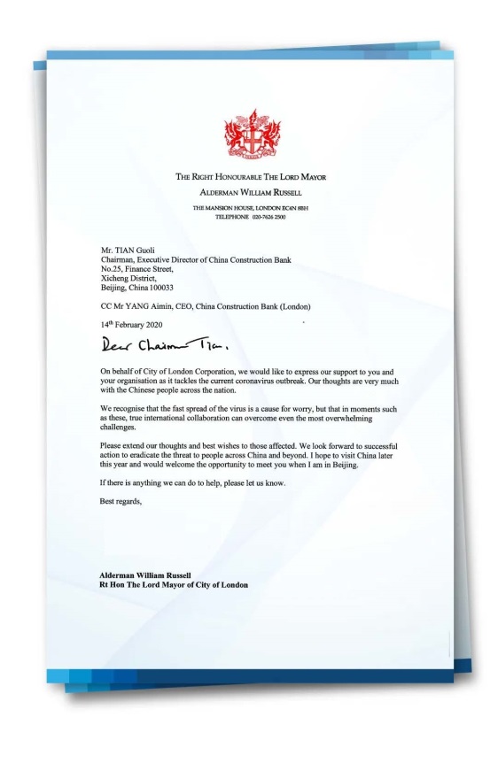 2020年2月14日,伦敦金融城市长罗威阁下代表伦敦金融城致信中国建设银行CEO田国立先生并抄送中国建设银行伦敦分行CEO杨爱民先生,向受疫情影响的人员表达了最诚挚的关心与祝福,并强调,如果需要伦敦金融城提供任何帮助,可随时与之联系。“我们的信念与祝福一直与中国人民同在。尽管新型冠状病毒的快速传播着实令人担忧,但是我们相信真正的国际合作可以帮助我们克服一切挑战。”