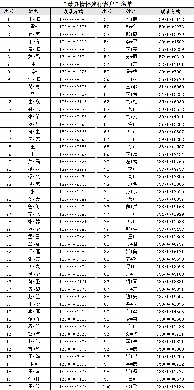 值此狗年新春来临之际,为感谢广大客户对建设银行的支持与关爱,内蒙建行在自治区范围内选取持有建行个人金融产品数量最多的前100名客户(数据截至2018年1月底,持有产品数量相同的按客户金融资产余额由高到低排序)为“最具情怀建行客户”,开展感恩回馈,为每位获奖客户赠送精美回馈礼品。现将名单公布如下: