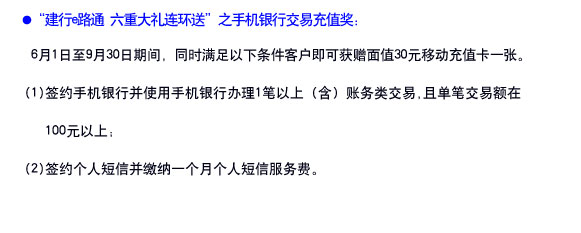 “李哥,你一直在各方面默默帮助我!为略表小妹感谢之意,刚刚给你交了30元话费。” 小安一脸得意的坏笑。面对小安的先斩后奏,李峰愣了一下,说:“客气啥!哥哥照顾妹妹是应该的!我一会把交话费的钱还给你。”“你这才叫客气,这充值卡是银行送的!”看到李峰感兴趣,小安继续说道,“我办理了建行手机银行和短信服务,前几天还用手机银行给你转账。建行就送我30元手机话费充值卡。” “有这好事,快说说!”李峰问道。“你不知道呀!建行现在有一个‘建行e路通 六重大礼连环送’活动,还有机会中液晶电视呢!” ……