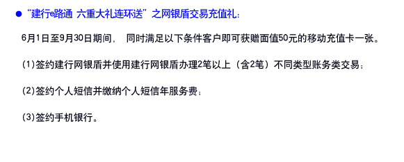 “建行e路通 六重大礼连环送,购买建行网银盾7.5折优惠,签约建行网银盾并使用建行网银盾办理2笔以上交易就赠送50元充值卡,还有机会获得液晶电视、数码相机呢!”牛盾兴奋地说。