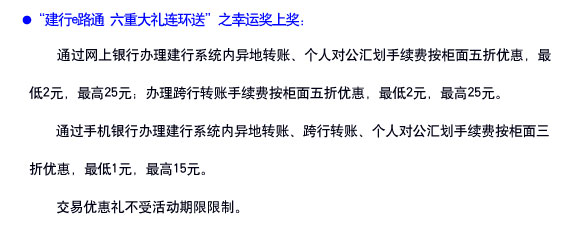 “通过建行网上银行和手机银行办理转账都有手续费优惠,网上银行办理转账手续费是柜面的五折,最低2元,最高25元。通过手机银行办理转账手续费是柜面的三折,最低1元,最高15元,非常划算。现在办理不但有手机话费充值卡赠送,还能参加幸运大抽奖,有机会中液晶电视、数码相机呢!”