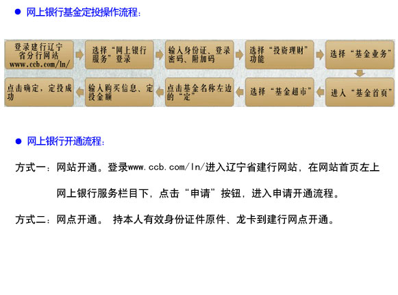 “您可开通建行网上银行基金定投业务,约定每月的申购金额和申购日期,由建行在每月固定申购日自动完成基金申购。您平时登录网上银行看看交易明细,基金市值一目了然,即可轻松理财。基金定投可以“聚沙成塔”,在不知不觉中积攒一笔不小的财富。”