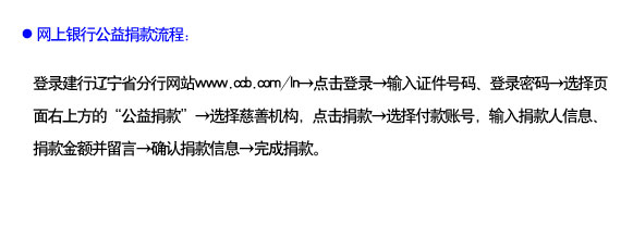 牛盾拍了一下大腿说:“我想起来了,建设银行就提供了公益捐款的平台。我们可以用建行网上银行或手机银行捐款,直接将钱捐到指定慈善机构的银行账户,还可以留言注明捐款用途。”