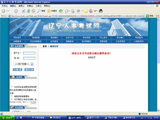 在辽宁人事考试网站“公务员考试专区”栏目,进入“中央机关极其直属机构录用公务员考试报名确认”,点击左侧功能栏“查询缴费情况”,查询确认缴费情况,缴费成功后即完成本次网上报名全部工作,等待下次网上打印准考证。