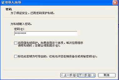 注意:“启用加强保护”则导出后的证书只可于限定IE版本或更高版本级别使用,如IE5.0以上;您可根据需使用计算机IE版本选择。
