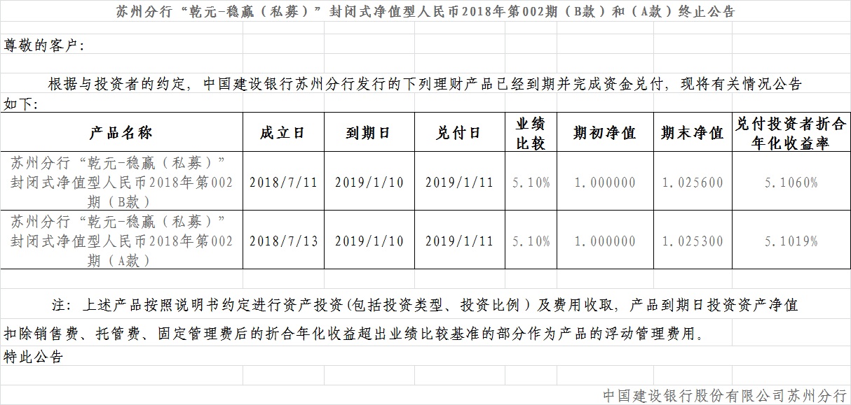 苏州分行“乾元-稳赢(私募)”封闭式净值型人民币2018年第002期(B款)和(A款)终止公告
