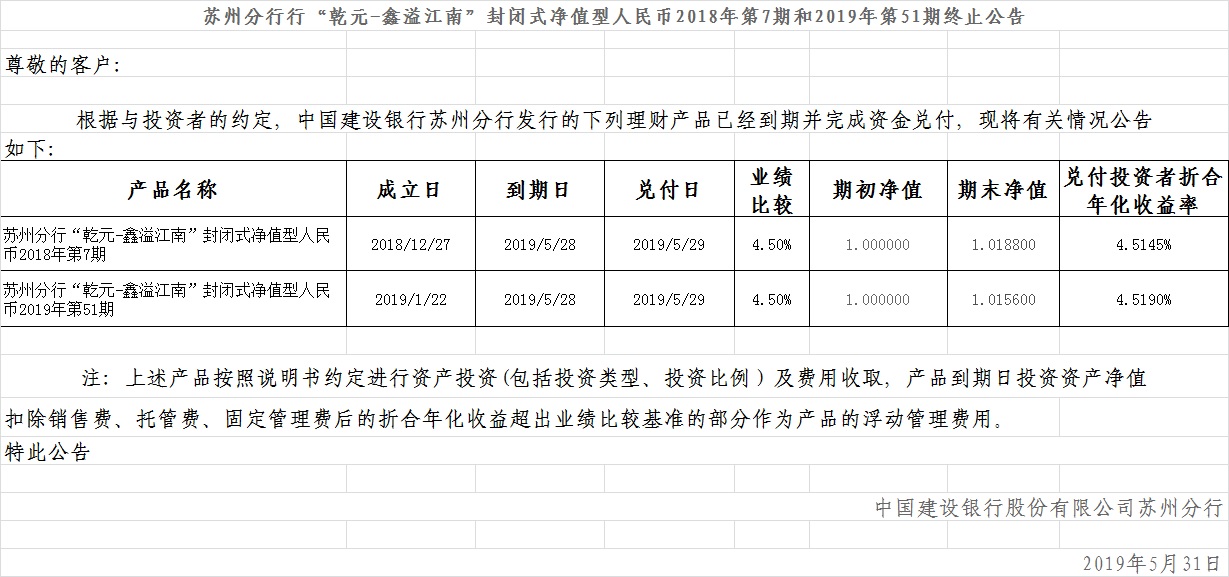 中国建设银行理财产品终止及清算公告