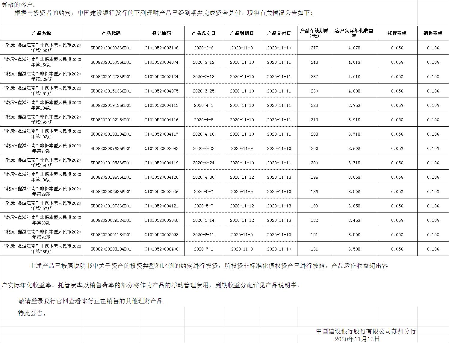 中国建设银行理财产品终止及清算公告