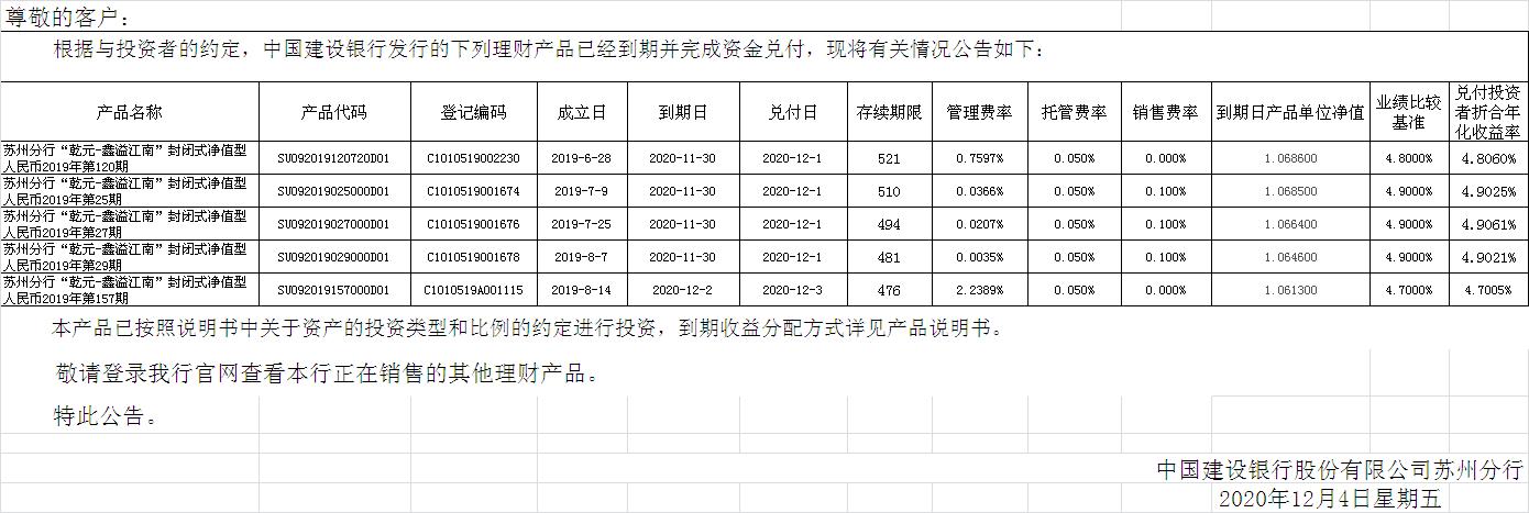 中国建设银行理财产品终止及清算公告