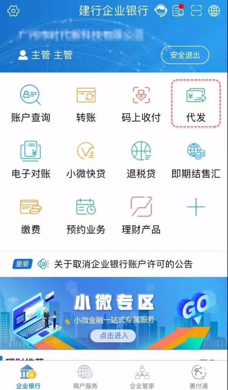 点击首页“代发”,可依据操作员权限完成代发制单、代发复核、代发流水查询等操作,动动手指即可随时随地办理代发业务。