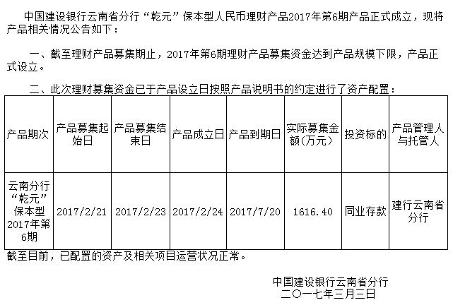 中国建设银行云南省分行“乾元”保本型人民币理财产品2017年第6期成立公告