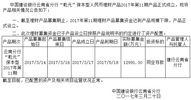 中国建设银行云南省分行“乾元”保本型人民币理财产品2017年第11期成立公告