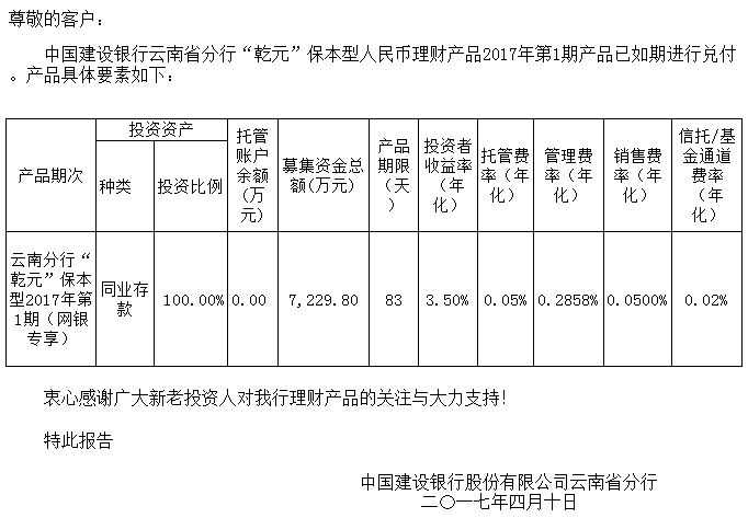 中国建设银行云南省分行“乾元”保本型人民币理财产品清算报告