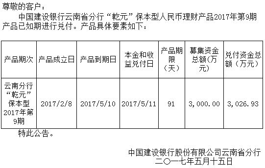 中国建设银行云南省分行“乾元”保本型人民币理财产品2017年第9期兑付公告