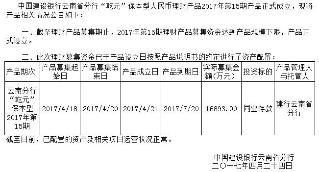 中国建设银行云南省分行“乾元”保本型人民币理财产品2017年第15期成立公告