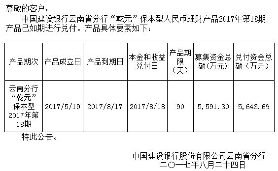 中国建设银行云南省分行“乾元”保本型人民币理财产品2017年18期兑付公告