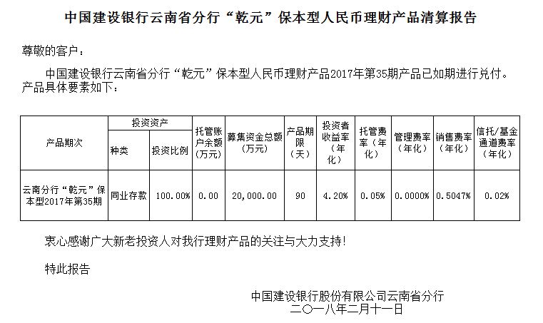 中国建设银行云南省分行“乾元”保本型人民币理财产品清算报告