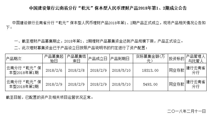 中国建设银行云南省分行“乾元”保本型人民币理财产品2018年第1、2期成立公告