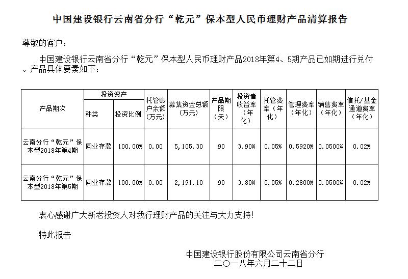 中国建设银行云南省分行“乾元”保本型人民币理财产品清算报告