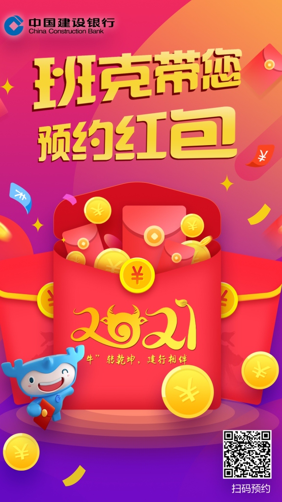 中国建设建设银行拟在2021年春节期间发行贺岁新钞现金红包产品,我行客户均可通过手机银行、个人网银、班克扫码、掌上网点、劳动者港湾等渠道,以及我行指定网点进行预约兑换,现将有关事项公告如下: