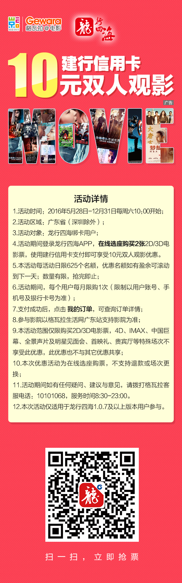 下载建行龙行四海APP,参与“10元双人观影”活动,每周六10元抢两张2D/3D电影票!