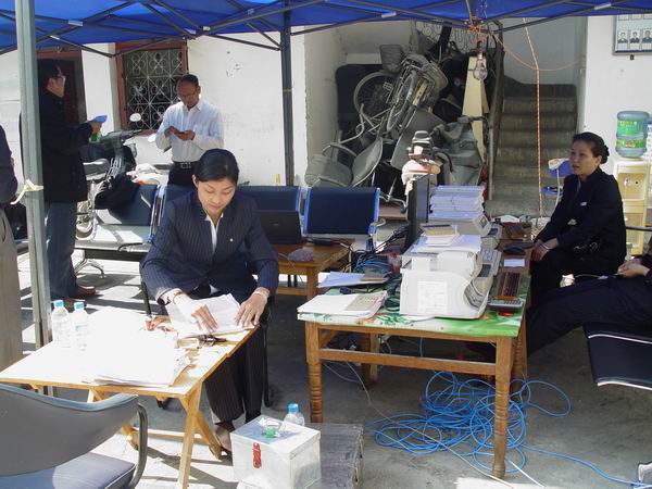 图为建行盈江支行员工正在搭建临时帐蓬,恢复营业的情景。