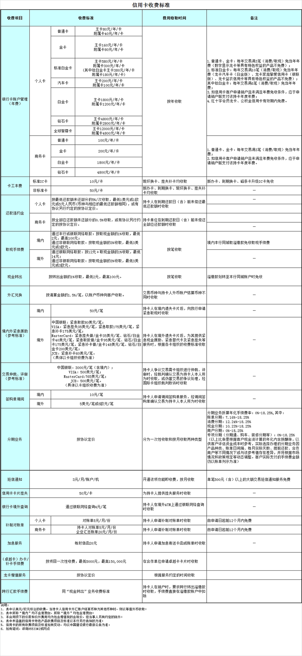 附:中国建设银行龙卡信用卡收费项目及标准