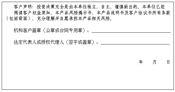 您签署本风险揭示书、客户协议书,并将资金委托给中国建设银行运作是您真实的意思表示。本风险揭示书及相应的客户协议书、产品说明书、客户权益须知将共同构成贵我双方理财合同的有效组成部分。