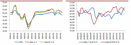 市场回顾 2010年上半年,我国经济增长总体向好,投资和出口持续保持较高增长速度,消费增速也相对平稳,PMI指标持续保持在50以上。但是,投资增速持续下降,出口高增长的可持续性存在担忧。二季度以来国家出台了一系列宏观调控措施,促进经济结构调整,提高经济增长质量。产业政策方面,政府出台严厉的房地产宏观调控政策,遏制房价过快上涨;出手整顿地方融资平台,防止地方政府债务压力继续膨胀;出台一系列行业指导意见,防止过剩产能,促进新兴产业发展;金融政策方面,货币政策稳中趋紧,央行持续回笼货币以对冲外来流动性;财政存款增速远大于财政支出,也收紧了市场的资金供给。 图:PMI生产指数回落,预计工业生产继续放缓 图:库存指数的反向变动显示生产产销状况下行