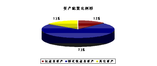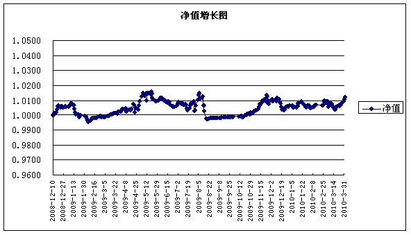三、操作回顾 债券投资方面,由于组合已经基本调整到位,报告期间,我们继续维持债券投资和产品期限相匹配的久期配置策略,获得了稳定收益。同时我们也积极参与新股申购,在银行间回购利率上行过程中,加大了逆回购操作力度。 股票投资方面,基于本账户保本策略的要求,我们根据市场的变化,及时对股票仓位进行调整,重点关注相关设备制造业、通信板块及化学产品制造业等板块,获得一定收益。 截至 2010年 3月 31日 ,本理财产品信托账户资产净值合计为36879万元,资产单位净值为1.0120元,收益率为1.2%。 在大类资产配置中,权益类资产市值为46060295.45元,占净值比重为12%;固定收益类资产市值为268635783.00元,占净值比重73%;其它资产市值为54309799.54元,占净值比重的15%。