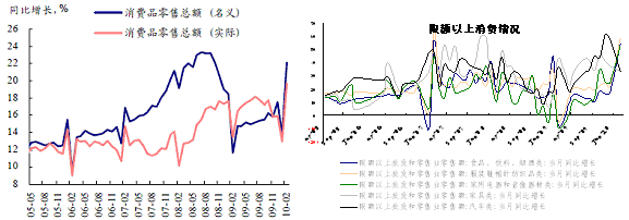 数据来源:WIND 从国内宏观经济数据来看,3月PMI从上月的52回升至55.1,强劲反弹3.1个百分点。表明中国制造业3月份的扩张,与全球制造业复苏进程一致。 其次,3月国内新订单指数58.1、出口订单指数54.5,升幅都超过4个百分点,这表明内需外需、外需恢复势头良好,显示着整个3月份宏观数据也将再现经济强势复苏的趋势,对做多力量形成有力支撑。 图2:消费依然保持较快增速 图3:消费有升级迹象