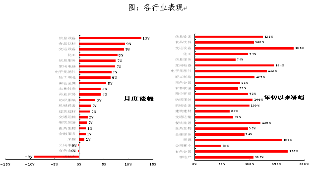 12月份信息设备、食品饮料、交运、化工、信息设备等行业表现较好;房地产、有色、公用事业、采掘等行业表现较弱。