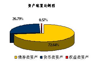 大类资产配置中,债券类资产市值39598.3万元,占净值比重为72.64%,权益类资产市值为312.3万元,占净值比重为0.57%;现金类资产市值为14554.3万元,占净值比重为26.79%。