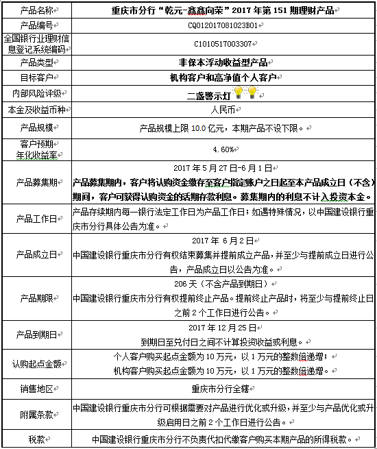 本产品为非保本浮动收益型理财产品,不保证本金和收益,请您充分认识投资风险,谨慎投资。本期产品期限为206天(中国建设银行有权对产品进行展期或提前终止),存续期内,产品不接受申购或赎回申请。本期产品内部风险评级级别为二盏警示灯,风险水平属于较低风险。最不利情况下,您将损失全部收益甚至包括全部本金。本理财产品适用于收益型、稳健型、进取型 、积极进取型客户。