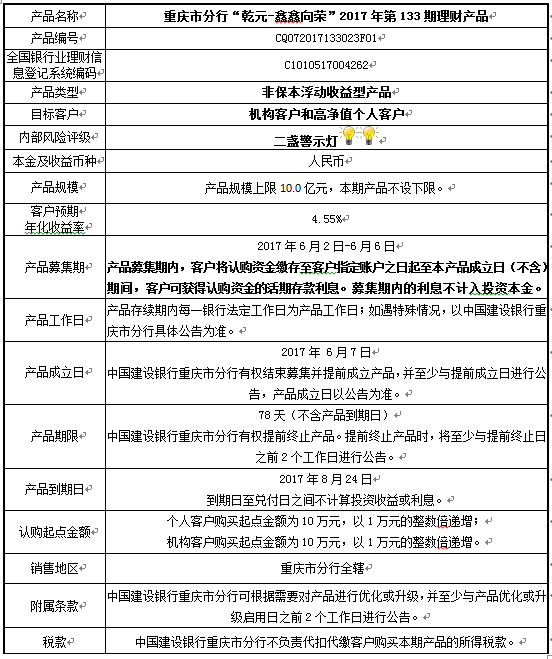 本产品为非保本浮动收益型理财产品,不保证本金和收益,请您充分认识投资风险,谨慎投资。本期产品期限为78天(中国建设银行有权对产品进行展期或提前终止),存续期内,产品不接受申购或赎回申请。本期产品内部风险评级级别为二盏警示灯,风险水平属于较低风险。最不利情况下,您将损失全部收益甚至包括全部本金。本理财产品适用于收益型、稳健型、进取型 、积极进取型客户。