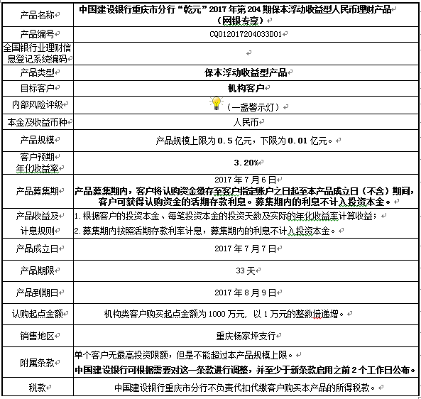 1.本产品规模上限:0.5亿元。在本期产品募集期内,对本期产品的认购金额达到本期理财产品规模上限,则中国建设银行重庆市分行有权利但无义务停止本期产品的认购,已经认购成功的客户投资权益不受影响。