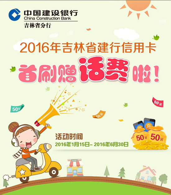 2016年1月1日- 2016年6月30日期间,持卡人首次开卡并刷新卡交易(含消费、透支取现)三笔累计金额达到158元,即可在“建行吉林分行信用卡”微信订阅号申请获赠50元手机话费,每月限量1200份,每个持卡人活动期间限赠1次,话费将于符合消费条件次月充值到客户在我行预留系统手机,先到先得,送完即止。