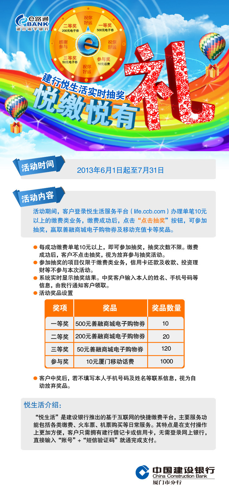 厦门建行第二季悦生活缴费实时抽奖活动火热进行中